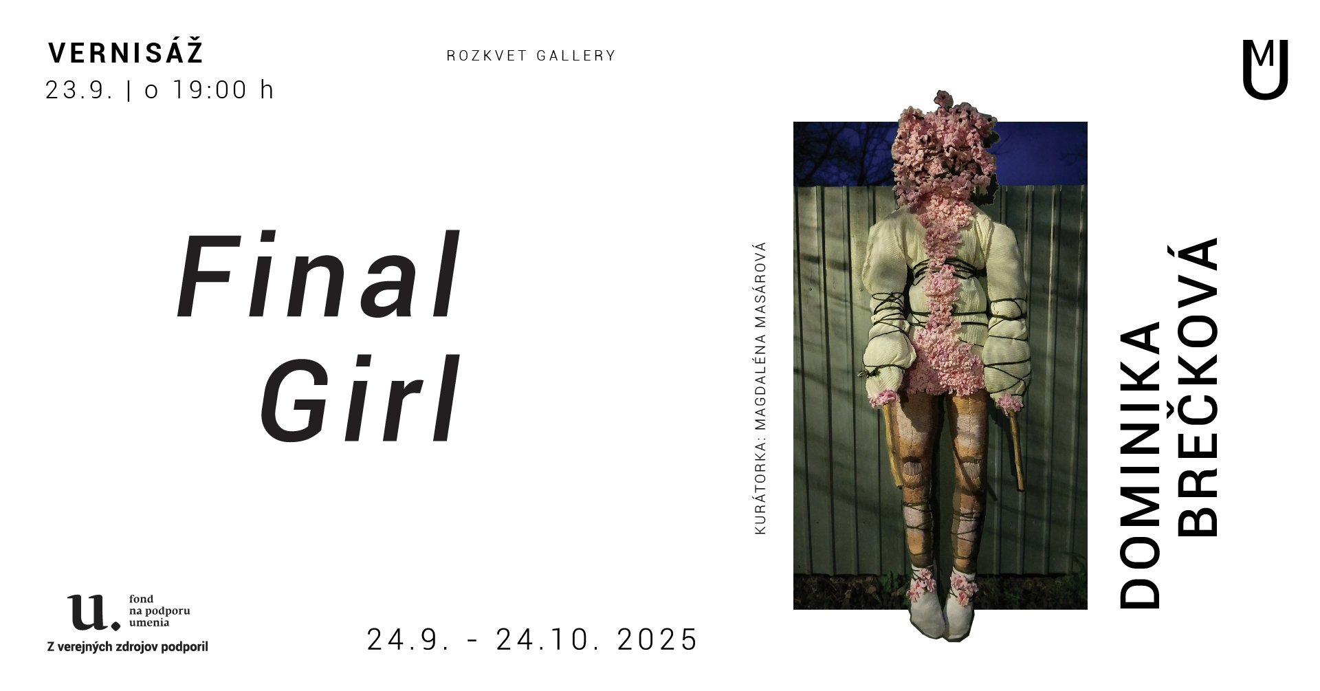 POZÝVAME VÁS NA VERNISÁŽ VÝSTAVY FINAL GIRL autorka: Dominika Brečková vernisáž: 23.9. 2025 | utorok | o 19:00 hod. kurátorka: Magdaléna Masárová trvanie výstavy: 24.9. - 24.10. 2025 ut, st 12:30 - 17:00 | so 13:00 - 17: 30 ostatné dni po telefonickej dohode +421 951 559 379
